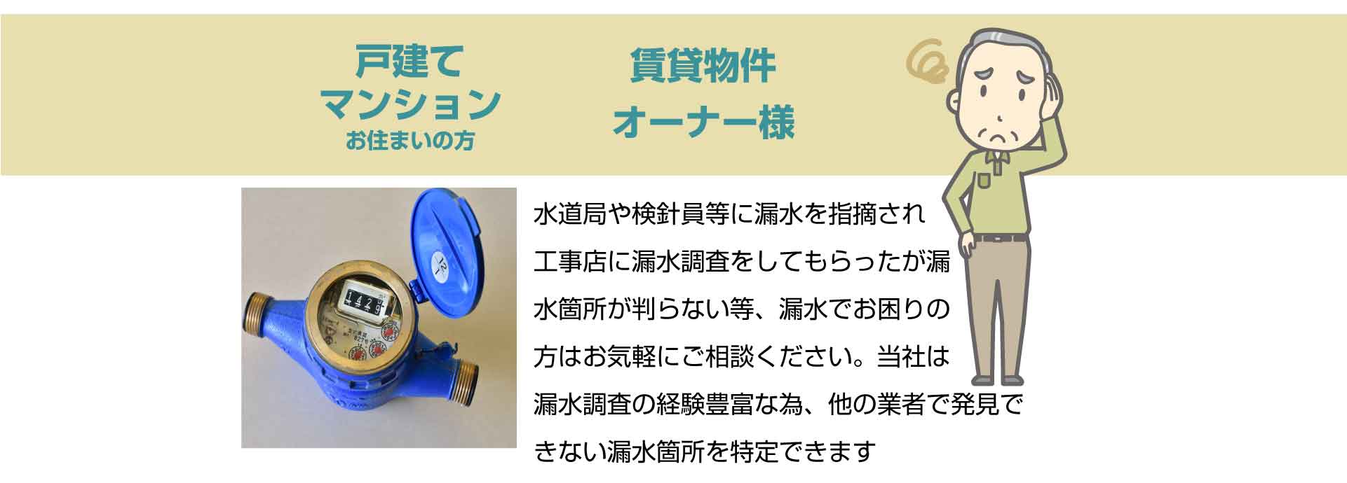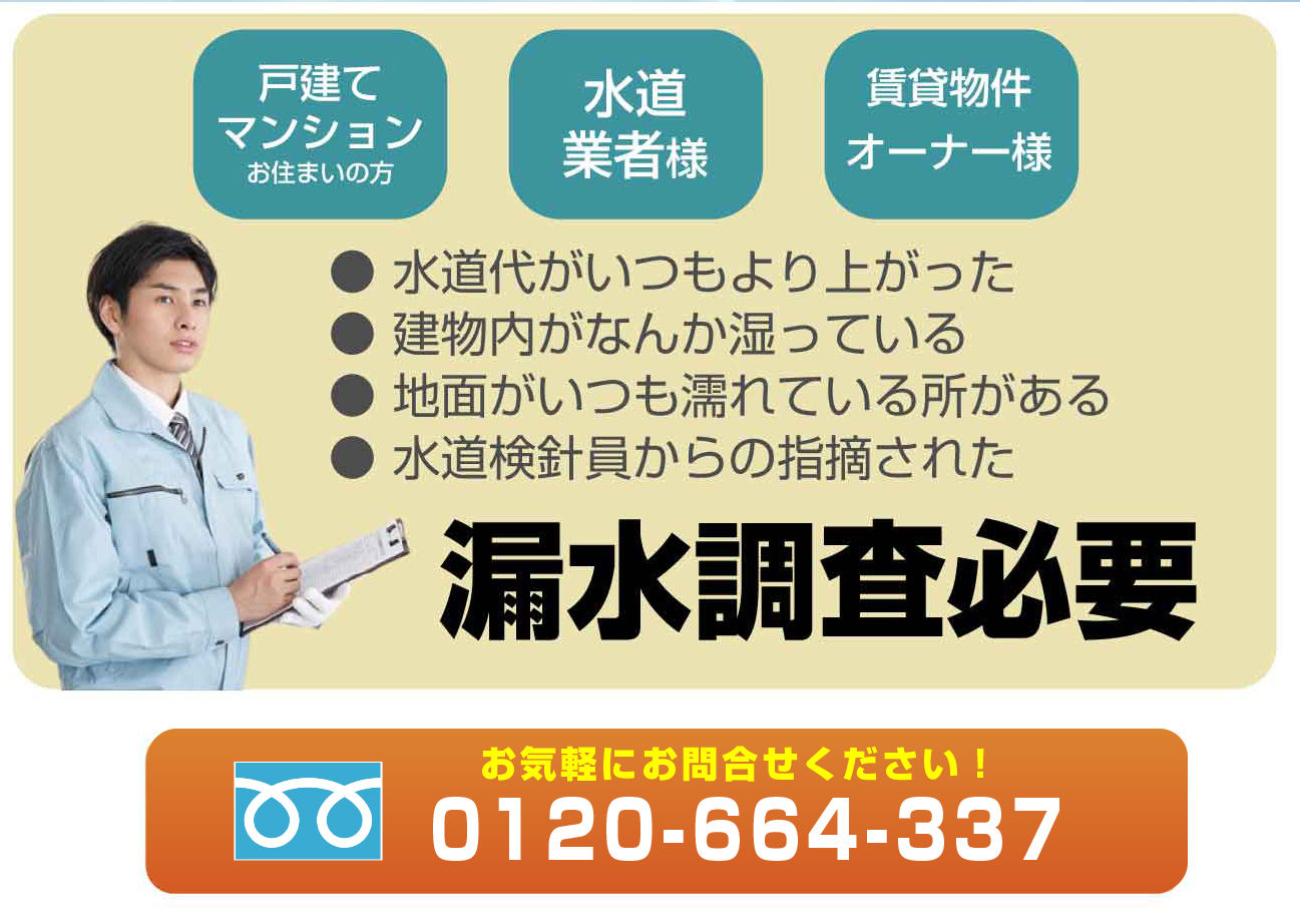まずは最寄りの工事店で調査をしてもらい、漏水箇所が発見できない等お困りの方はご相談ください。